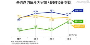 [시사저널e=김희진 기자] 중위권 카드사들이 2위 자리를 두고 치열한 접전을 벌이고 있다. 2위를 지키던 삼성카드의 자리를 현대카드와 KB국민카드가 무서운 속도로 따라붙으면서다. 삼성카드는 좁혀진 점유율 격차 외에도 마이데이터 사업 심사 중단 등의 악재가 잇따르면서 고민이 깊어지는 모습이다.7일 금융감독원 금융통계정보시스템에 따르면 삼성카드는 지난해 4분기 개인·법인 신용판매액 기준 점유율이 17.93%로 전분기(18.30%) 대비 0.37%포인트 하락했다.반면 삼성카드와 함께 중위권 경쟁자로 꼽히는 KB국민카드는 지난해 4분기 기
