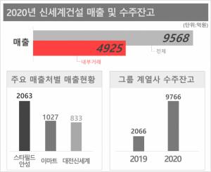 [시사저널e=길해성 기자] 신세계건설의 내부거래 의존도가 여전히 높은 것으로 나타났다. 지난해 매출 절반 이상이 이마트 등 그룹 계열사로부터 발생했다. 내부거래를 통한 수주잔고 역시 4배 이상 급증했다. 재벌가의 일감 몰아주기 관행을 근절하려는 정부의 기조에 역행하고 있다는 지적이 나온다. ◇내부거래 매출 4925억원···수주잔고 ‘2066억→9766억원’ 급증8일 금융감독원 전자공시시스템에 공시된 사업보고서를 살펴보면 신세계건설은 지난해 최대주주인 이마트를 포함한 특수관계자로부터 4925억원의 건설수익을 올렸다. 이는 전체 매출