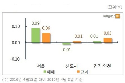 15일 부동산114에 따르면 이번주 서울 아파트 평균 매매값은 지난주에 비해 0.09% 상승했다. 전체적으로 안정적이지만 일부 지역에서 희비가 엇갈렸다. 신도시와 경기‧인천은 각각 –0.01%, 0.01%의 변동폭을 보였다.