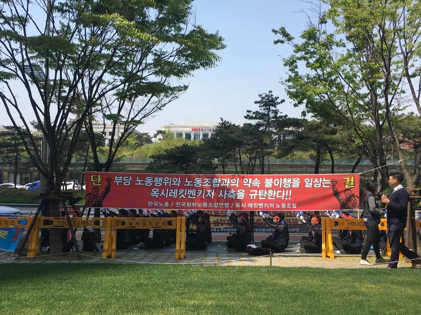옥시 익산 생산 공장 노조는 4일부터 3주째 매주 월요일 옥시 한국법인이 있는 서울 여의도 국제금융센터 앞에서 시위를 벌이고 있다.