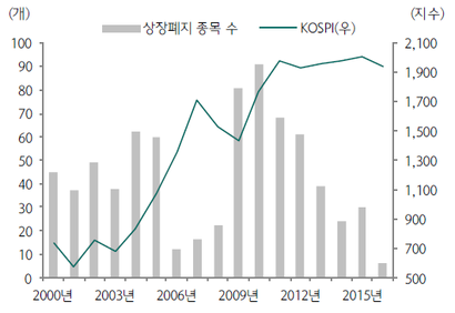 실제로 코스피에서는 상장폐지 종목이 늘던 해에 주가가 상승 추세를 보인 것으로 나타났다. 반면 상장폐지 종목이 줄던 해에 코스피는 중립 이하의 추세를 보였다.