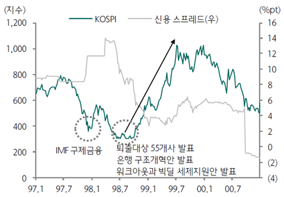 이번 구조조정은 IMF 당시와 같은 주식시장의 추세적 반등은 어려울 것이라 지적도 나왔다. 구조조정의 추진주체들의 성격과 속도가 과거와는 다르다는 점 때문이다.