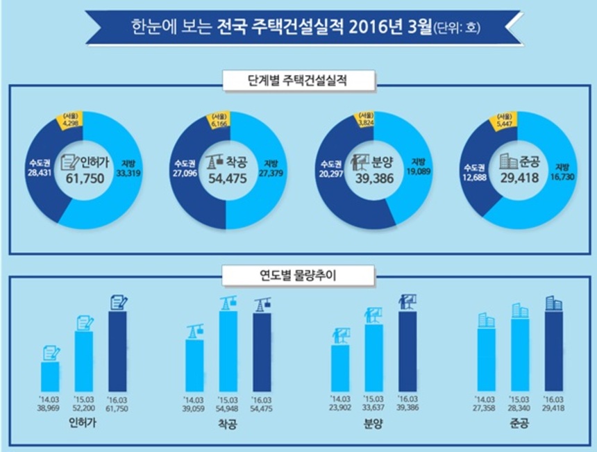 이에 비해 수도권 인허가 실적은 7만9184가구로 지난해 6만1288가구보다 29.2% 늘었다. 경기지역이 46.6%의 증가률로 압도적인 증가세를 나타냈다. 반면 ▲서울(-2.4%) ▲인천(-23.2%)은 인허가 실적이 되레 줄었다.