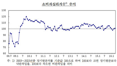 소비자심리지수는 소비자들이 느끼는 경제상황을 나타내는 지표다. 장기평균치(2003년 1월~2015년 12월)를 기준값 100으로 두고 이보다 크면 낙관적, 작으면 비관적임을 의미한다.