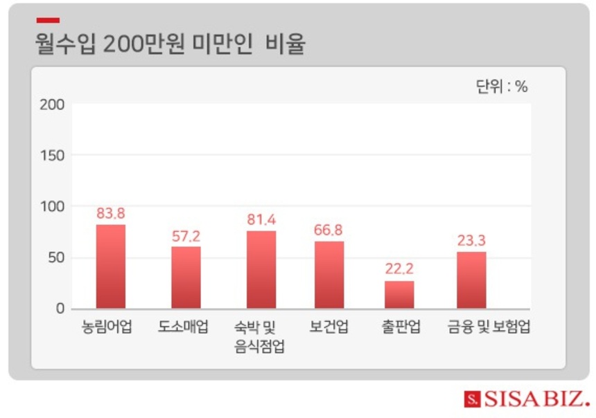 숙박·음식점업 종사자 중 월수입이 200만원 이하인 인구는 81.4%였다. 도소매업 종사자 가운데 월수입이 200만원 미만인 인구의 비중도 절반을 상회했다. 보건업·사회복지서비스업 종사자들 중 한달에 200만원 미만으로 버는 사람들은 66.8%였다.