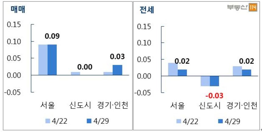 부동산114에 따르면 4월 마지막 주 전국 평균 아파트값은 지난주에 비해 0.04% 올랐다. 지난 3월 18일 보합 이후 6주 연속 오름세다. 수도권은 3주간 이어진 0.05% 박스권을 넘어 0.01% 포인트 상승했다.