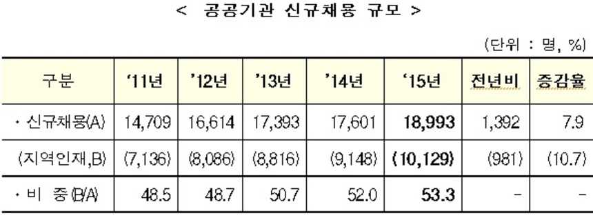 특히 공공기관 혁신도시 이전으로 지역인재 채용이 처음으로 1만명을 넘어섰다. 지난해 1만129명을 뽑아 전체 신규채용 규모의 53.5%를 차지했다.