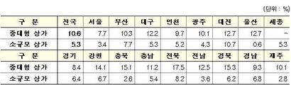 국토교통부는 올해 1분기 상업용부동산 임대동향을 조사한 결과 소규모 상가와 중대형 상가의 공실률이 각각 5.3%와 10.6%로 직전 분기에 비해 모두 0.3%p씩 상승했다고 3일 밝혔다. 전체건물의 일부 상가만 표본으로 조사하는 특성상 집합상가의 공실률은 산정되지 않았다.