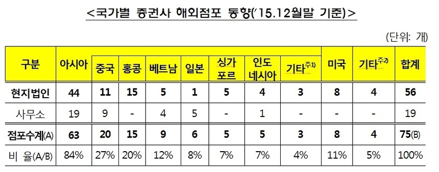 금감원 관계자는 "국내 증권사 실적에서 해외점포가 차지하는 비중이 크지 않다"며 "증권회사의 해외진출 관련 애로사항, 감독당국에 대한 요구사항 등을 지속적으로 수렴하고 필요시 지원방안을 적극 마련할 것"이라고 말했다.