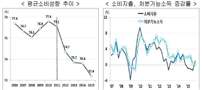 2011~2015년 처분가능소득 증가율은 평균 2.7%였지만 소비지출 증가율은 평균 1.1% 늘어나는데 그쳤다.