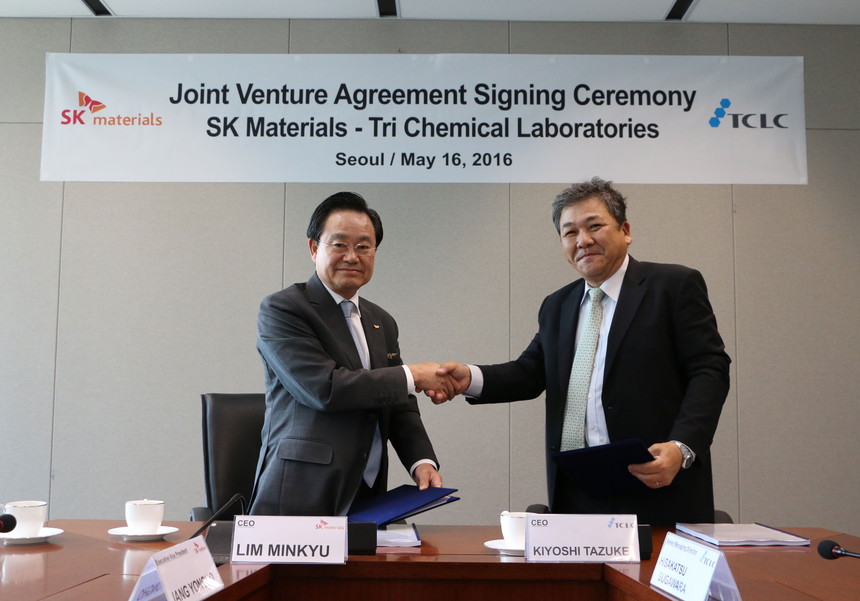 SK머티리얼즈는16일 서울 사무소에서 임민규 대표와 키요시 타즈케 트리케미칼 대표가 참석한 가운데 생산‧연구개발‧판매를 위한 합작법인 설립 계약을 체결했다.