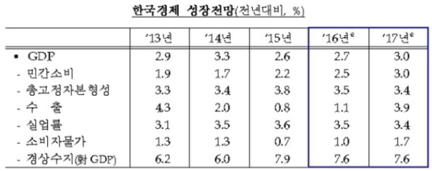 OECD는 16일 발표한 ‘2016년 한국경제보고서’에 따르면 올해 한국 국내총생산(GDP) 성장률이 2.7%에 그칠 것으로 내다봤다. 지난해 11월 전망치(3.1%)보다 0.4%포인트 낮춘 것이다. 내년 성장률 전망치도 3.6%에서 3.0%로 수정했다.