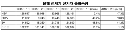 세계 시장에서 올해 2월 하이브리드차 판매량은 12만6161대로 지난해 같은 기간과 비교해 7.3% 감소했다. 같은 기간 플러그인 하이브리드차(1만4983대)와 순수 전기차(2만1690대)는 전년 동기 대비 각각 53.8%, 41.3% 늘었다.