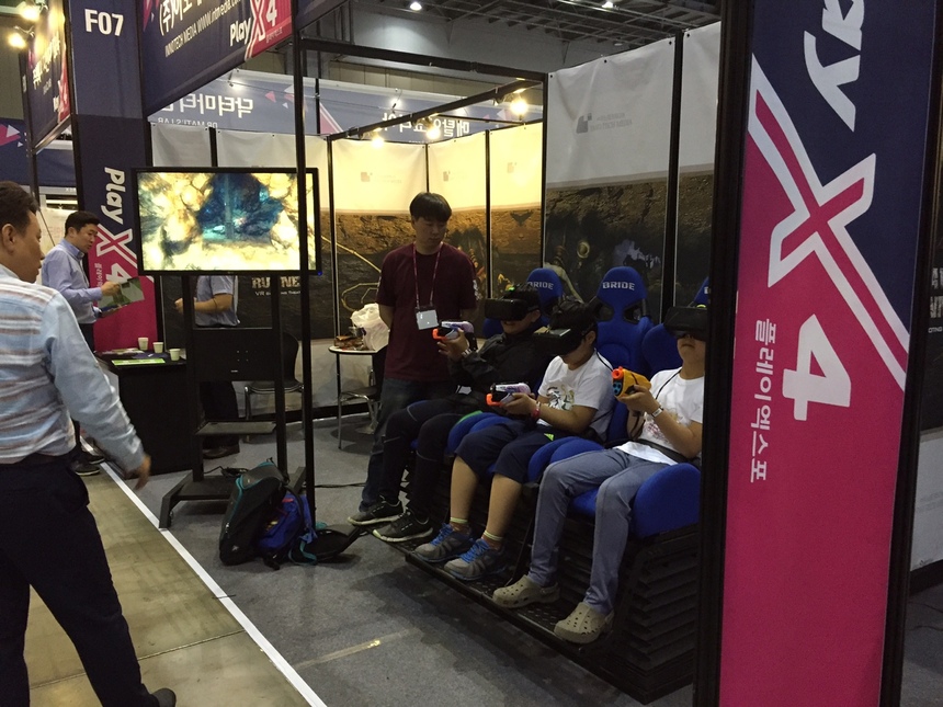 차세대 융복합 게임쇼 ‘플레이엑스포(PlayX4)’가 19일 대단원의 막을 올렸다. 기존 기능성 게임에만 한정됐던 ‘굿게임쇼 코리아’에서 벗어나 체험형 미래 게임 전시회로 확대·개편됐다. 특히 가상현실(VR) 기기를 이용한 게임들이 돋보였다.