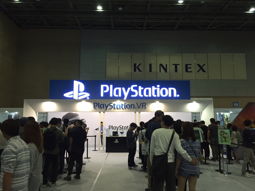 이번 전시회에서 가장 인기가 높았던 부스는 VR게임 관련 부스였다. 그 중에서도 단연 압도적인 인기를 자랑한 곳은 소니의 플레이스테이션 VR이었다. 길게 늘어선 줄은 줄어들 기미를 보이지 않았다.