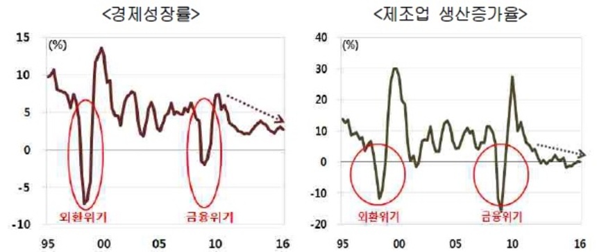 하지만 최근 제조업 생산증가율이 우하향 추세를 보이며 서비스업 생산증가율도 하락하는 모습이다. 한국은행에 따르면 국민계정상 제조업 생산증가율은 2014년 1분기를 정점으로 급락한 이후 저성장 국면을 이어가고 있다. 지난해 하반기 생산증가율이 소폭 상승했지만 기술적 반등으로 평가되고 있다. 서비스업 생산증가율은 2014년 3분기를 정점으로 하락 추세를 이어가고 있다.