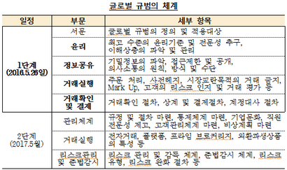 글로벌 규범은 크게 서문과 윤리, 관리체계, 정보공유, 거래실행, 리스크 관리 및 준법감시, 거래 확인 및 결제 등 6개 부문으로 나뉜다. 1단계는 부문별 기본원칙과 윤리, 정보공유, 거래실행, 거래확인 및 결제에 대한 세부원칙이다.