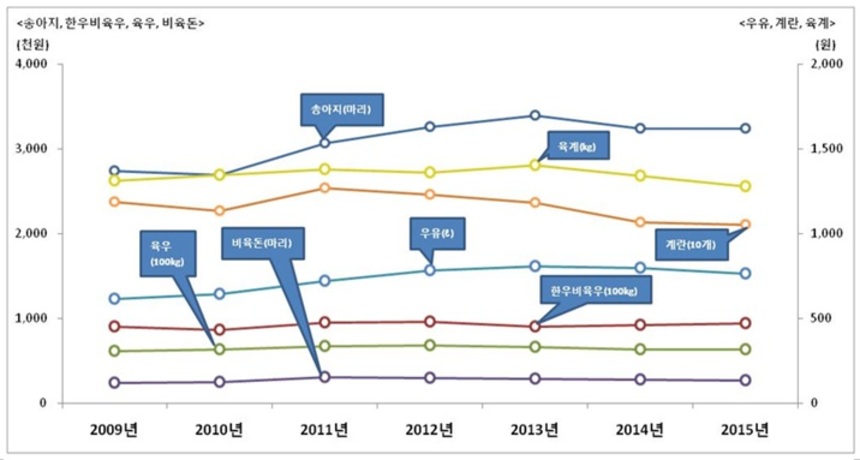 지난해 육계∙우유 등 축산물생산비가 감소한 것으로 나타났다. 사료가격 하락에 따른 사료비 감소 영향 때문이다. 한우비육우를 제외한 모든 축종에서 전년보다 줄었다.
