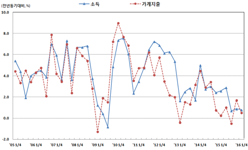 1분기 가계 실질소득이 0.2% 감소했다. 가계소득증가율이 물가상승률에 못미친 탓이다. 실질소득증가율은 지난해 3분기 1% 아래로 떨어진 후 회복모멘텀을 찾지 못하고 있다.