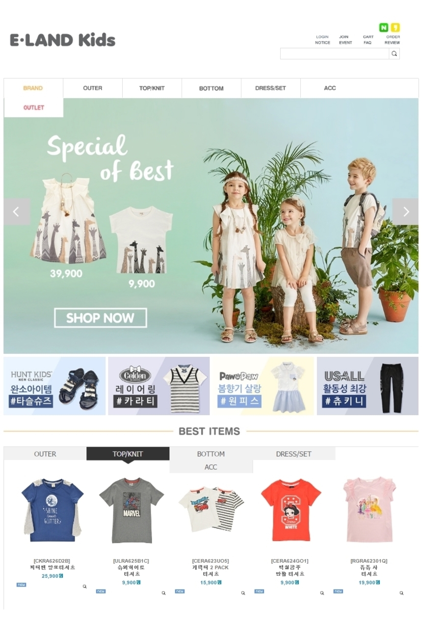 아동복 시장의 강자 이랜드가 통합 온라인 쇼핑몰로 국내 온라인 시장에 진출 한다. 10개 아동 브랜드의 인기 상품 700여개를 이랜드 쇼핑몰에 내걸었다.