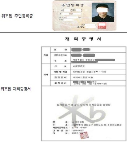 #보이스피싱 사기범 A씨는 국민은행 업무지원부 대리를 사칭하며 피해자에게 금리 4% 대출을 안내했다. 시기범은 위조된 신분증과 재직증명서 사진을 피해자 휴대폰으로 전송했다. 이후 대출 보증료(약 700만원)를 사기계좌로 이체하게 한 후 이를 가로챘다. 조사 결과 재직증명서는 가짜였다. 실제 국민은행 문서와도 양식이 달랐다.