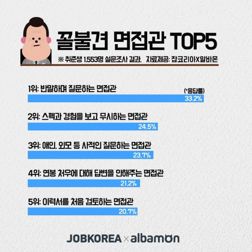 다음으로 △스펙과 경험 등을 보고 무시하는 면접관(24.5%) △결혼, 애인, 외모 등 개인적인 질문을 하는 면접관(23.7%) △연봉 처우 등에 대해 명확히 답변을 안 해주는 면접관(21.2%) △이력서를 처음 검토하는 듯한 면접관(20.7%) 등이었다.