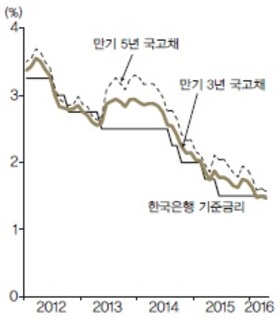 한국은행에 따르면 3년 만기 국고채 금리는 기준금리를 인하하기 시작한 2013년 4월 2.68%에서 이달 현재 기준금리(1.5%)보다 낮은 1.47%로 떨어졌다. 5년 만기 국고채 금리도 기준금리와 비슷한 수준(1.57%)까지 내려왔다.