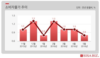 1일 통계청이 발표한 5월 소비자물가동향에 따르면 지난달 소비자물가지수는 지난해 같은 기간보다 0.8% 올랐다. 전월대비 물가지수는 동일했다. 2~4월 소비자물가지수는 줄곧 1%대를 유지했다. 지난 3개월 간 전년동월대비 소비자물가지수 상승률은 각각 2월 1.3%, 3월 1.0%, 4월 1.0% 였다.