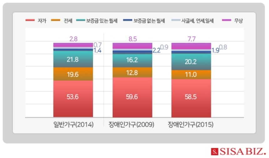 국토교통부는 이같은 내용을 담은 ‘지난해 장애인 가구 주거실태 조사 결과’를 2일 밝혔다. 장애인 가구 주거형태는 ▲자가 58.5% ▲월세 20.2% ▲전세 11.0% 순으로 나타났다. 2009년에 비해 자가와 전세 비율이 각각 1.0%p, 1.8%p 감소한 반면 보증금 있는 월세 비율은 4.0%p 증가했다.