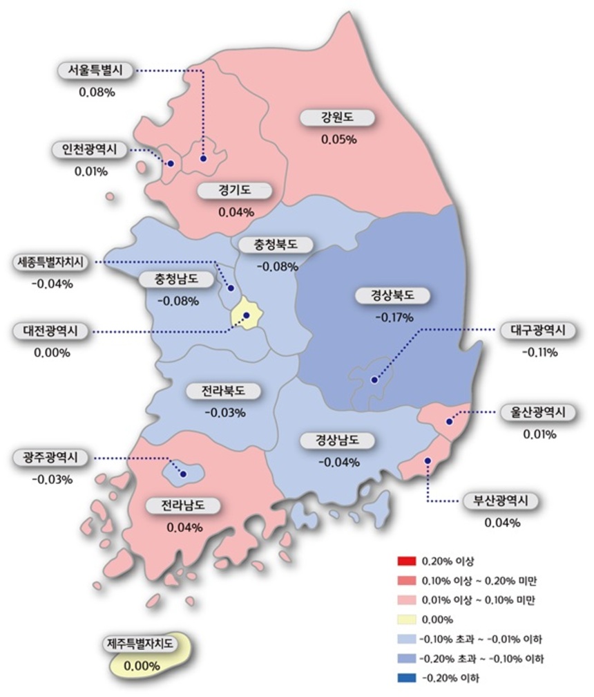 시도별로 강원(0.05%) 부산(0.04%) 전남(0.04%) 등은 상승했고, 제주(0.00%) 대전(0.00%)은 보합, 경북(-0.17%) 대구(-0.11%) 충남(-0.08%) 등은 하락했다.
