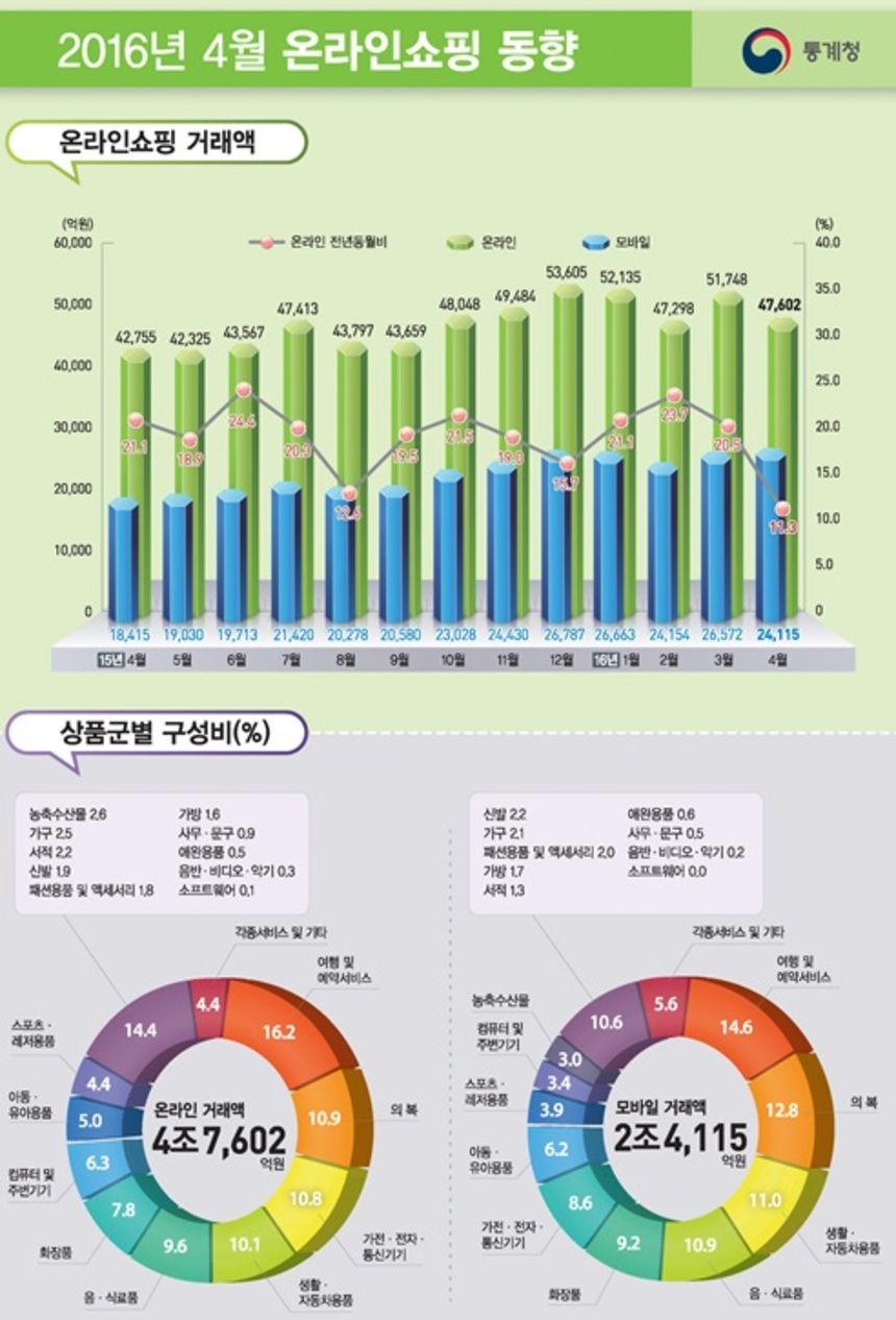 4월 온라인쇼핑 거래액은 전년동월에 비해 11.3% 증가폭에 그쳤다. 2014년 1월 11%를 기록한 이후 가장 낮은 증가폭을 기록한 것이다.