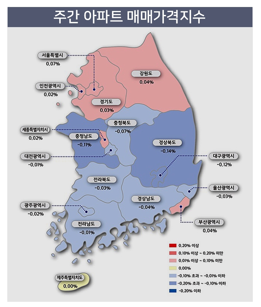 지방 아파트값은 –0.04% 하락했다. 내림폭이 점차 커지고 있다. 시·도별로 ▲부산(0.04%) ▲강원(0.04%)은 상승했으나 제주(0.00%)는 보합, ▲경북(-0.14%) ▲대구(-0.12%) ▲충남(-0.11%)은 내림세다.