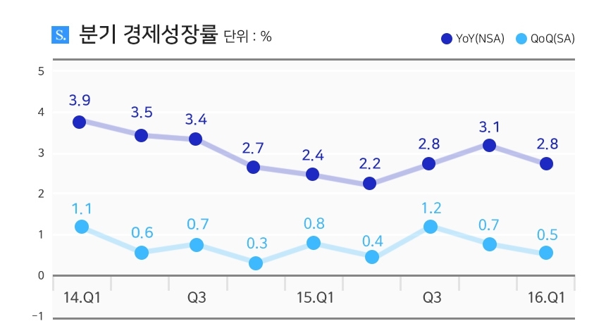 한국은행에 따르면 올해 1분기 경제성장은 투자와 민간소비 기여도 하락으로 지난해 4분기에 비해 둔화된 것으로 나타났다. 경제성장률은 지난해 3분기 1.2%에서 4분기 0.7%로 떨어졌고, 올해 1분기엔 0.5%를 기록했다. 메르스(중동호흡기증후군) 사태 충격을 받았던 지난해 2분기(0.4%) 이후 최저치다.