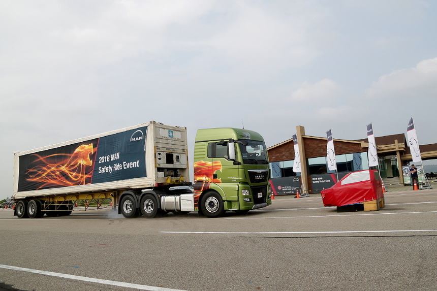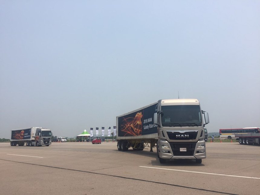 만트럭코리아는 40톤이 넘는 트랙터가 앞차와 거리를 알아서 조정하고 긴급 상황엔 별도 조작 없이 제동에 나서는 기술을 국내에 선보였다.