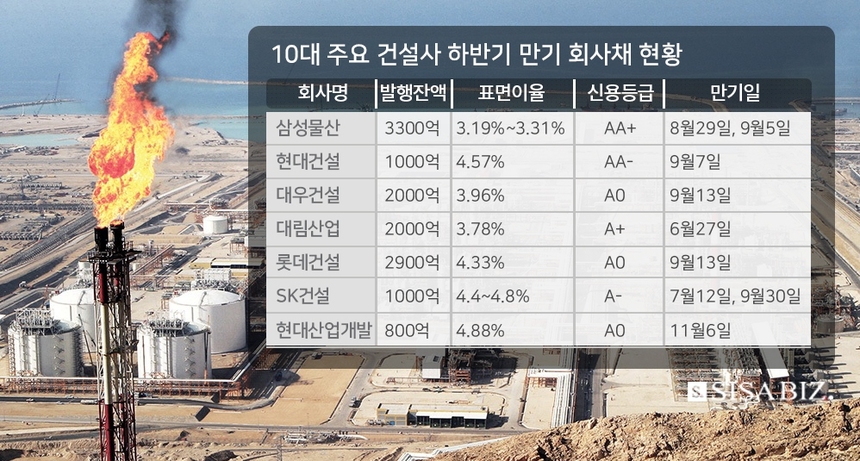 14일 한국예탁결제원에 따르면 토건 시평액 기준 상위 10대 건설사 중 올 하반기 회사채 만기가 도래하는 건설사는 총 7곳이다. 만기도래 회사채의 회사별 금액을 보면 ▲삼성물산(3300억) ▲롯데건설(2900억) ▲대림산업 (2000억) ▲대우건설(2000억) ▲현대건설(1000억) ▲SK건설(1000억) ▲현대산업개발(800억) 순이다.