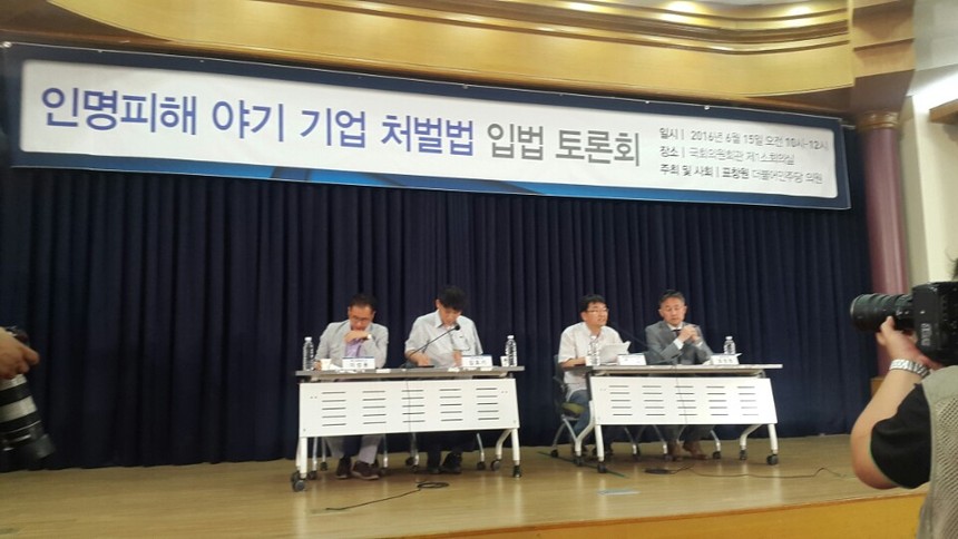 15일 표창원 의원실은 국회 의원회관에서 인명피해 야기기업 처벌법 입법토론회를 열고 기업이 야기한 사망사고 실태와 입법 필요성, 기업처벌법의 구체적 입법 방향 등을 논의했다.