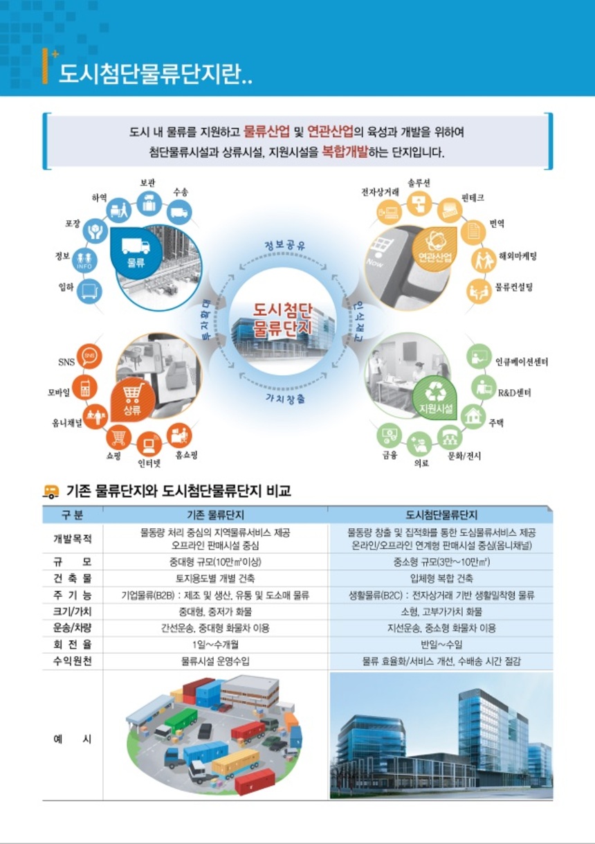 도시첨단물류단지는 낙후된 도심 물류‧유통시설에 첨단산업을 접합해 융복합 단지로 재정비할 수 있도록 도입된 제도다. 기업과 소비자간(B2C) 물류시장의 급성장에 대응하기 위한 목적으로 제도를 도입했다고 국토부 관계자는 말했다. 지난해 5월 제3차 규제개혁장관회의에서 해당 법안이 처음 소개됐고 12월 법적근거가 마련된 상태다.