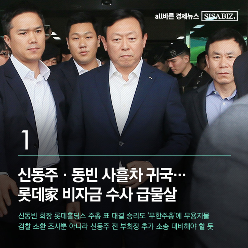 신동주·동빈 사흘차 귀국… 롯데家 비자금 수사 급물살 저작권자 © 시사저널e 무단전재 및 재배포 금지 김재일 기자 kojell@sisabiz.com 페이스북 인스타그램 유튜브 이메일(으)로 기사보내기 다른 공유 찾기 기사스크랩하기 개의 댓글 회원로그인 댓글 내용입력 댓글 정렬 최신순 추천순 답글순 BEST댓글 BEST 댓글 답글과 추천수를 합산하여 자동으로 노출됩니다. 닫기 더보기 댓글삭제 삭제한 댓글은 다시 복구할 수 없습니다. 그래도 삭제하시겠습니까? 비밀번호 닫기 댓글수정 댓글 수정은 작성 후 1분내에만 가능합니다. 본문 / 400 비밀번호 닫기 내 댓글 모음 닫기