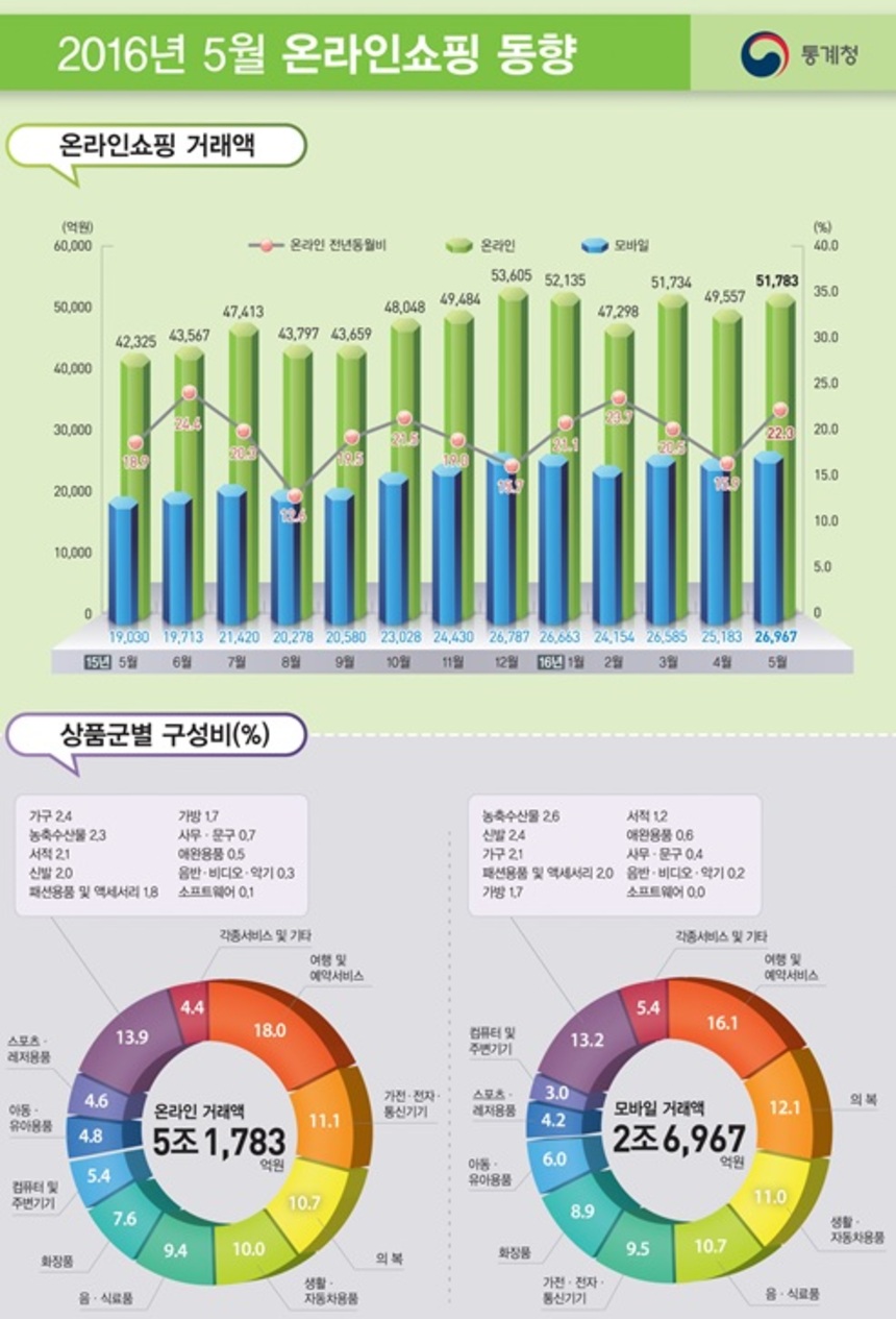 5월 온라인쇼핑 거래액은 전년동월에 비해 다시 20%대 증가폭을 나타냈다. 4월 온라인쇼핑 거래액은 전년동월에 비해 11.3% 증가폭에 그쳤다. 2014년 1월 11%를 기록한 이후 가장 낮은 증가폭을 기록하기도 했다.