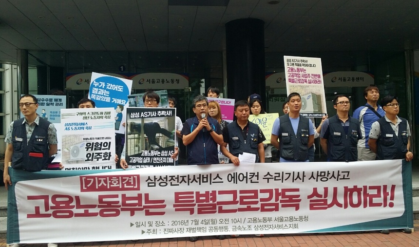 이들은 시민단체와 함께 4일 고용노동부 담당자들을 면담하는 자리에서 고용노동부가 특별감독팀을 꾸려 전국에 흩어져 있는 삼성전자서비스 사업장과 협력사의 안전실태를 점검·감독해야 한다고 주장했다. 이들은 또 이날 서울고용노동청 건물 앞에서 기자회견도 열었다.