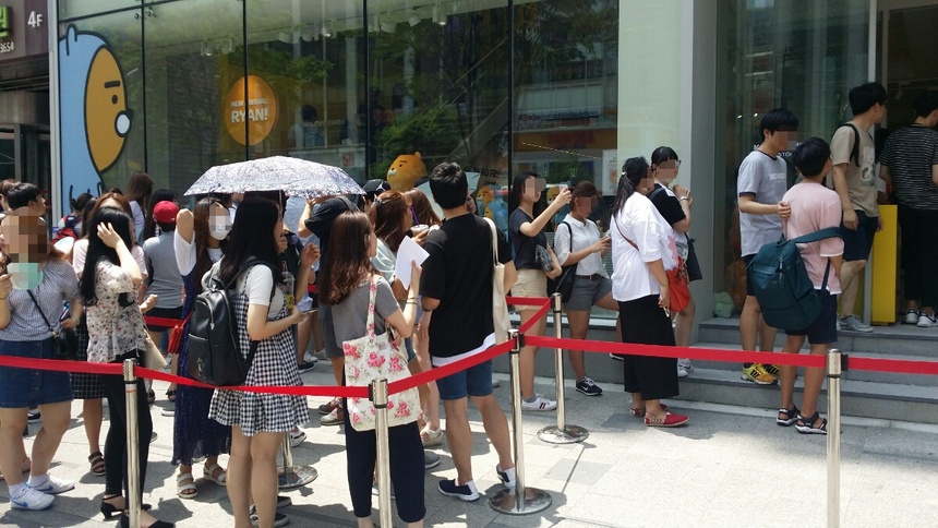반면 최근에 새로 생긴 강남역 카카오프렌즈 매장은 대다수 고객이 한국인이다. 오픈한 지 1주일 가까이 됐지만 평일(8일) 점심시간에도 20분 이상 대기해야할 정도로 줄이 길다. 매장을 찾은 장재현 씨(23)는 “카카오톡에서 쓰던 이모티콘을 대형 인형으로 보니 신기하다”며 “사람이 너무 많아 정신이 없다. 다음에 다시 방문하고 싶다”고 말했다.