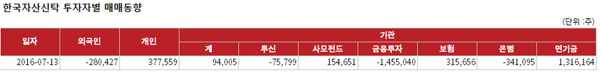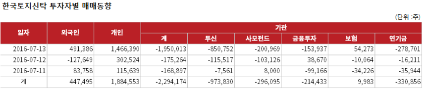 기관투자자들의 매도 공세도 부담이다. 한국토지신탁은 유가증권시장으로 이전상장한 지난 11일 이후 3거래일 연속 기관 투자자의 순매도가 나오고 있다. 이 기간 동안 기관은 92억원이 넘는 물량을 팔아치웠다. 코스닥에서 거래되던 기간을 포함하면 지난 6월 28일 이후 하루를 빼고 모두 기관은 매도 우위다.