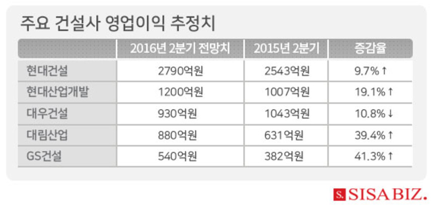 한 건설업계 관계자는 “국내 대형 건설사들은 저가 수주 해외사업장들이 하나 둘 준공 단계에 이르고 있고, 주택 매출에서 얻는 수익이 점점 늘고 있어 이번 2분기에 기대 이상의 실적을 거둘 가능성이 크다”고 전망했다.