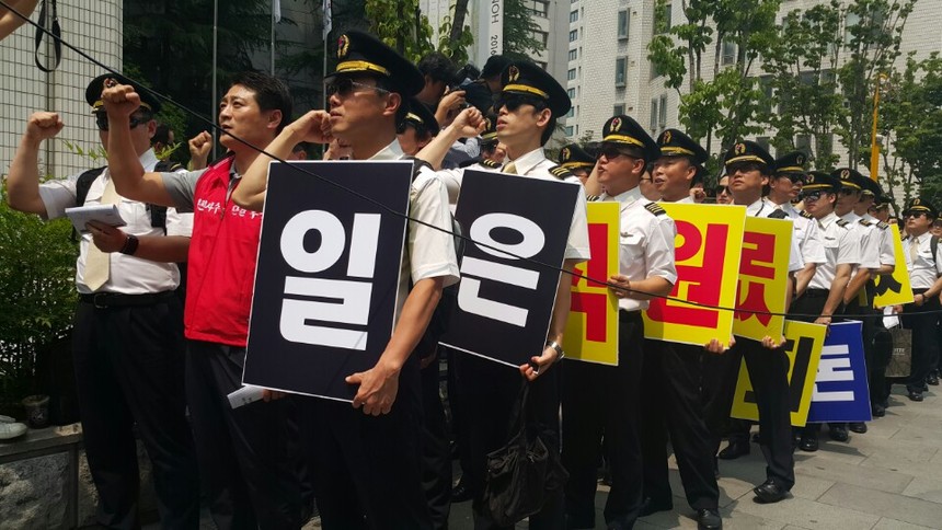 지난달 28일 대한항공조종사노조(KPU)는 서울 서소문 대한항공 빌딩 앞에서 '대한항공 임금정상화를 위한 윤리경영촉구결의대회'를 열었다. 조종사노조가 서소문 사옥 앞에서 집회를 열기는 2000년 이후 16년 만이다.