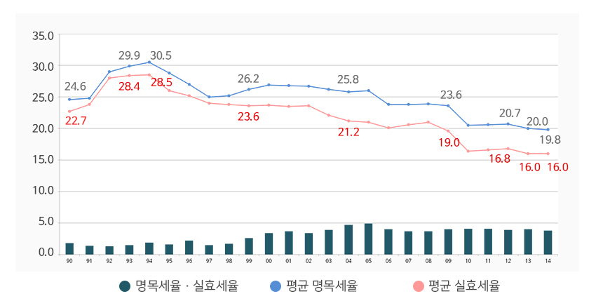 기업의 법인세 평균 실효세율은 1994년 28%에서 2014년 16%까지 하락했다. 지난해 기준 지방세를 포함한 법인 최고세율은 일본 34.62%, 미국 35.1%, 독일 39.2%, 프랑스 34.4%인데 비해 우리나라 법인세 최고세율은 24.2%(지방소득세 2.2% 포함)로 경제협력개발기구(OECD) 평균(25.3%)보다 낮았다.