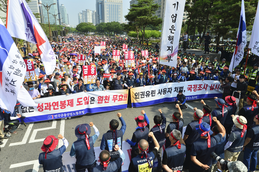 그는 이어 "이런 상황 때문에 이날 찬반투표도 쟁의행위 가결로 나올 것"이라며 "금융 노조는 성과연봉제 확대 도입 강행에 총파업으로 나설 수밖에 없다. 사측이 노조 협상과 별개로 물밑으로 성과연봉제 도입을 강행하고 있다"고 전했다.