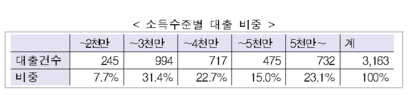 특히 연금소득자는 사잇돌 중금리 대출 비중이 미미했다. 연금소득자의 대출 비중은 1.5%(47건)에 불과했다. 소득이 있는 근로소득자(72.3%·2287건)와 사업소득자(26.2%·829건)가 98.5%의 대출 비중을 차지했다.