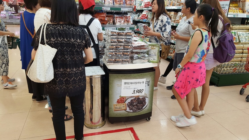 김을 파는 코너로 이동했다. 이미 판촉부스 앞에는 중국 관광객들이 줄을 지어 서있었다. 판촉행사를 하던 판매원은 “여기 오는 중국 사람들은 김, 과자, 화장품만 사간다”고 전했다. 그래서 그런지 롯데마트 서울역점은 유독 김 코너 규모가 컸다. 또 개별 김 제품 앞에는 각 제조사에서 만든 중국어 홍보문이 부착돼있었다.