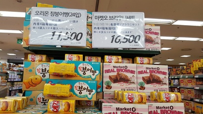 과자코너에는 유독 외국인 관광객이 많았다. 특히 오리온 과자의 인기는 뜨거웠다. 마켓오를 사가는 유커들이 여럿 눈에 띄었다. 마켓오 브라우니 세트는 2013년과 2014년 롯데마트 서울역점 유커 인기 상품 1위에 오른바 있다.