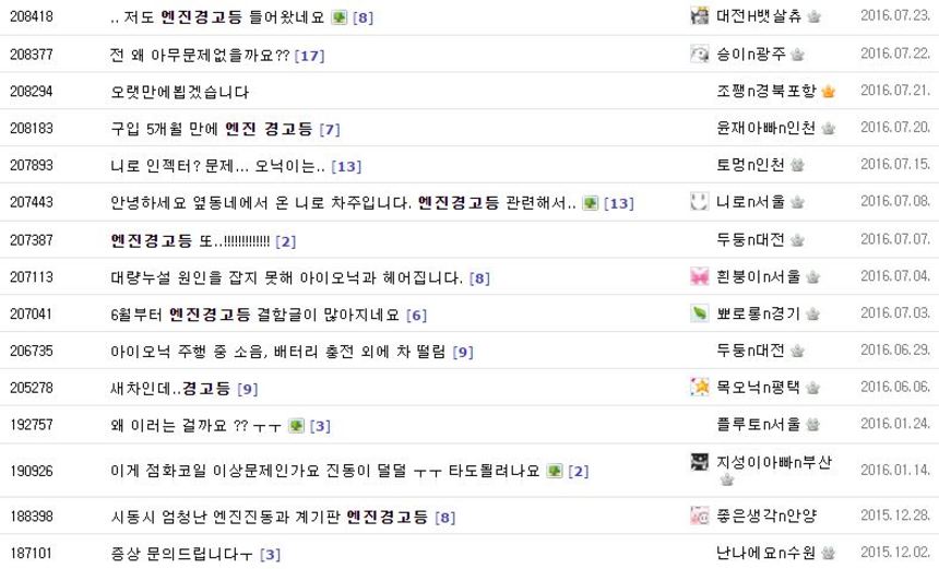 증상은 니로와 같다. 장기간 주차 뒤 시동을 걸면 차량 꿀렁임 현상이 나타나고 주행 중 엔진경고등이 점등된다는 것이다. 김해에 거주하는 아이오닉 차주는 지난 9일 아이오닉 동호회 사이트에 “엔진경고등 문제로 협력사 3회, 서비스센터 3회 입고했다. 센터에서 인젝터 문제를 말했다”며 “RPM이 높아지거나 연비가 갑자기 떨어진다면 인젝터 불량을 의심해보라”는 글을 올렸다.